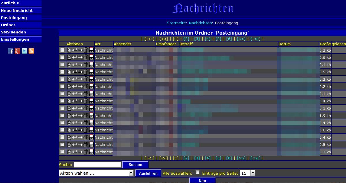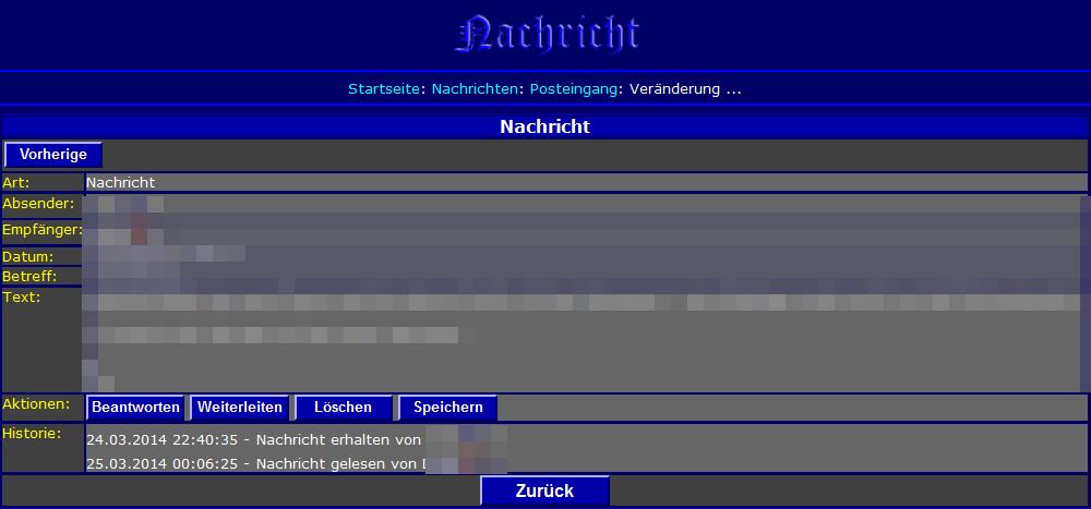 Im Posteingang wird mit dem Klick auf den “Betreff” oder mit dem Mausklick auf das “Brieftextzeichen” zu Beginn der Zeile die Nachricht geöffnet. Wenn es die neueste Nachricht ist, erscheint in dem neuen Fenster nur noch der obere Button “Vorherige”. Im anderen Fall gibt auf rechts oben noch einen Button “Nächste”. Der übrige Fensterinhalt ist wahrscheinlich intuitiv nachvollziehbar.