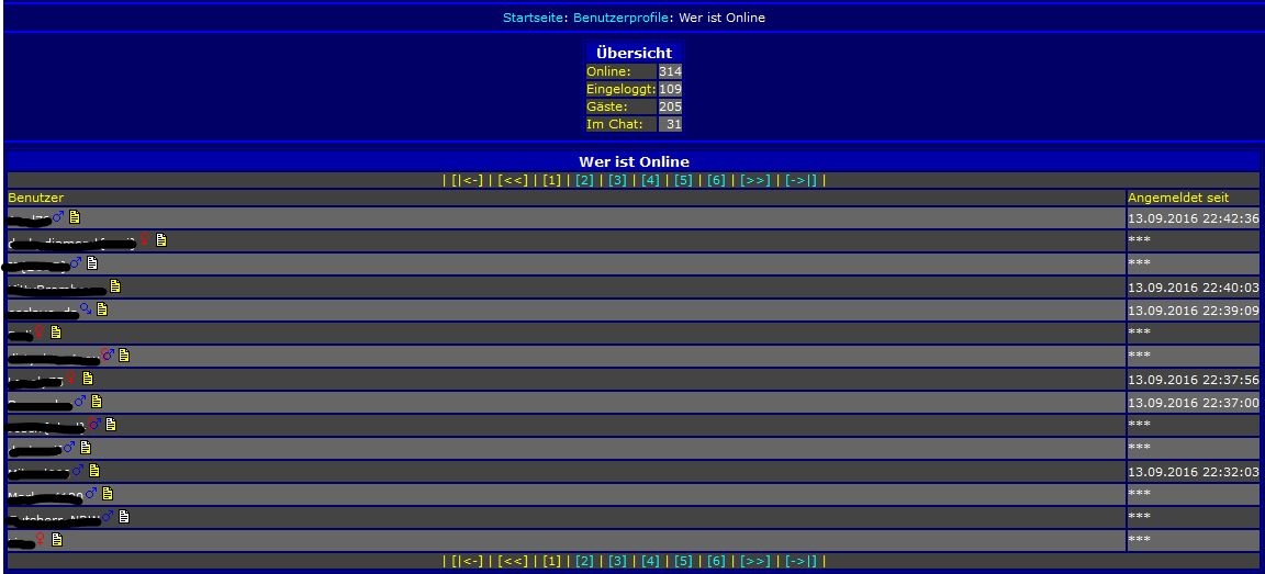 Die Nicks der aktuellen Onlinebesucher werden eingeblendet - bei einigen mit konkretem Tagesdatum und Uhrzeit, bei anderen nicht. Hinter dem Nick steht dann als Symbol “männlich - dominant” bis “weiblich - devot” in allen Schattierungen. Dahinter folgt ein weißes oder gelbes oder halbweiß/halbgelbes Symbol wie ein Dokument. Diese sind anklickbar und zeigen das Profil des Nickträgers.
